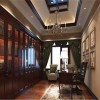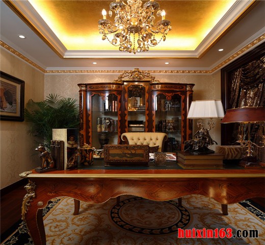 设计师通过此案很好的把握住了此种风格的设计理念,以厚重大方,优雅别致的基调惯始终。无论是色彩和线条的处理,或者是地面、墙面、顶棚的材质选择,再或者是三者的色调构成,都讲究协调统一的处理原则,同时,和书房家具配置的点缀相辅相承,呈现统一的布局力度。