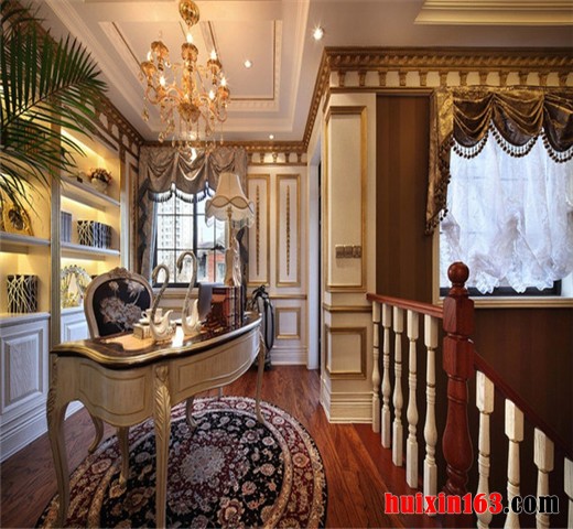 设计师通过此案很好的把握住了此种风格的设计理念,以厚重大方,优雅别致的基调惯始终。无论是色彩和线条的处理,或者是地面、墙面、顶棚的材质选择,再或者是三者的色调构成,都讲究协调统一的处理原则,同时,和书房家具配置的点缀相辅相承,呈现统一的布局力度。