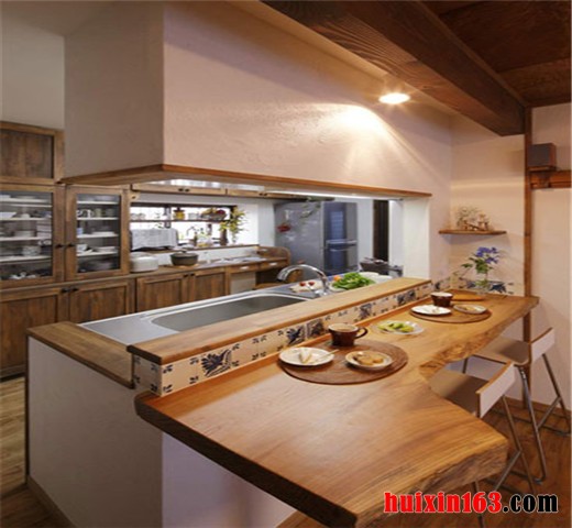 木质厨房用具的尽情投入、流畅发挥,使整个职能空间显现出一种自然天成的大自然气息。让人仿佛置身于大自然之中,可以自由的呼吸新鲜空气,宁静自然之感是不言而喻的。这种装修风格运用在厨房的装饰装修设计当中,是极为巧妙的处理。整体和谐自然,协调统一。