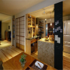 淡雅的基调是大部分日式系列家装所遵循的设计理念。设计中木质系列建材和厨房用具配置的使用,清晰可见的纹理表现,清幽的日式气息弥漫在空气中,这种情调,十分适合就餐的气氛。顶棚的处理,给人以沉稳之感。各种贴近实际的设计,不仅节省了空间,而且还显得美观大方。