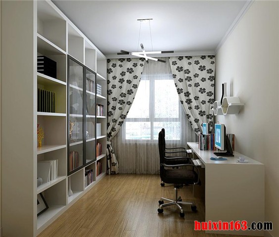 该案例以现代动感的理念进行创作设计,在实际操作过程中,设计方、施工方、业主三方进行了有效的沟通,确立了整体思路,营造了如图所示的效果。地板处理大气从容,墙面处理干净利落,吊顶处理简洁明快,整体协调错落有致,使书房的功能性得以体现的同时,又加入稍许舒适性的考虑,让二者得到有机的统一,构思巧妙,设计灵活