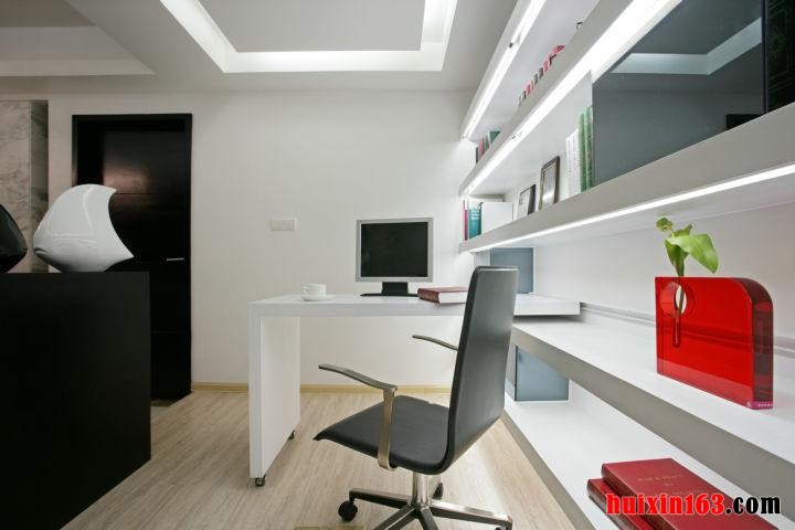 该案例以现代动感的理念进行创作设计,在实际操作过程中,设计方、施工方、业主三方进行了有效的沟通,确立了整体思路,营造了如图所示的效果。地板处理大气从容,墙面处理干净利落,吊顶处理简洁明快,整体协调错落有致,使书房的功能性得以体现的同时,又加入稍许舒适性的考虑,让二者得到有机的统一,构思巧妙,设计灵活