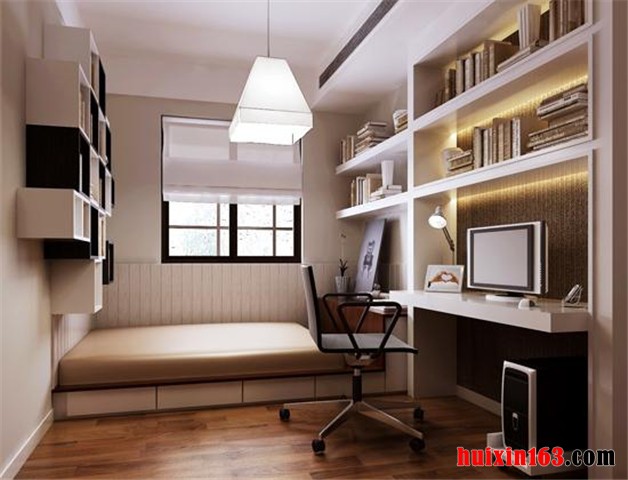 整体色调呈现明朗欢快、协调一致风格特点,现代风格的设计理念讲究贴合现代快节奏的生活特点,具体到书房的装修设计中,针对的是书房特定的区域空间。色彩选择方面,以高调的亮色和低调的暗色进行对比配置,或以其中一项做为点缀效果,看起来对比强烈,增加视觉冲击力,延伸空间视觉效果,起到了很好的作用。