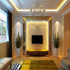影视墙看似只是起到一个背景的作用,但是在与整套房屋进行协调搭配的总体处理上,往往起着很大的装饰作用,视觉上能给人符合观影环境的整体冲击力,感官上能给人刺激。因此影视墙的装饰装修在实际操作过程中是一个重要的环节。此案整体大气从容、淡然别致。