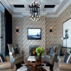 这套影视墙的设计从直观效果看上去,非常的有趣。构思巧妙的色彩把握将整面墙呈现出优雅华丽的状态。创意无限的线条配合将它的设计理念很好的诠释了出来,同时,依托着整个职能空间的特点,将影视墙的功能性和实用性,以及最重要的观赏性做到了有机的统一。