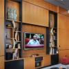 这套影视墙的设计从直观效果看上去,非常的有趣。构思巧妙的色彩把握将整面墙呈现出优雅华丽的状态。创意无限的线条配合将它的设计理念很好的诠释了出来,同时,依托着整个职能空间的特点,将影视墙的功能性和实用性,以及最重要的观赏性做到了有机的统一。