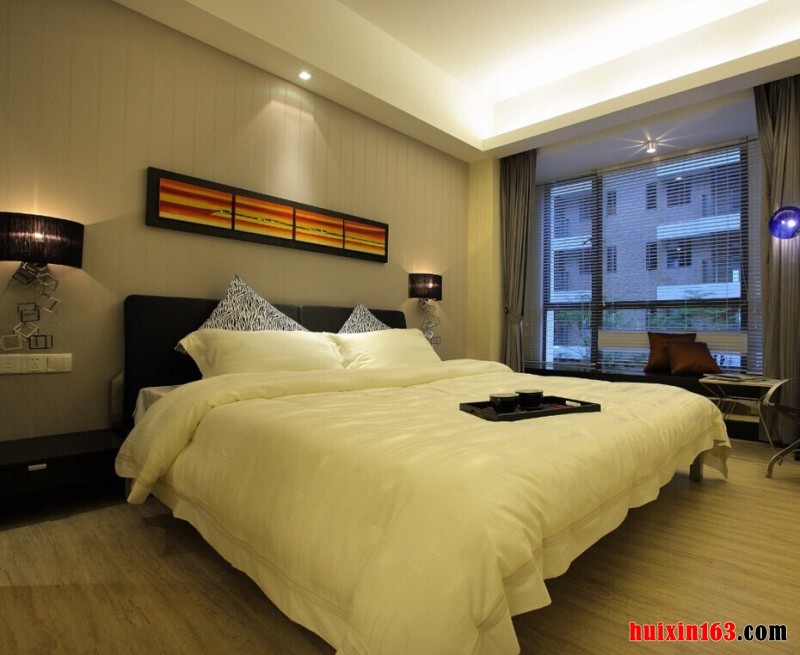 现代风的卧室装修,不管怎么装饰布置,都离不开一个明亮的光线,而窗户的安装设计就是重中之重,通过窗户才能让室内有一个亮丽饱和的自然光线,在搭配上灯饰的照射,不管是吊灯、射灯、壁灯或者是灯带等等,才能给人一种清新,雅致的感觉,与此同时还需要搭配上窗帘来调节空间的采光,深色还是浅色这就需要根据房间的实际情况来进行选择。