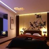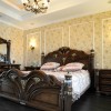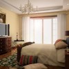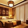 卧室的整个装饰着重点在实木装饰上,白色的石膏板吊顶装饰加深了空间的通透和延伸感,一个大型的古典吊灯的使用更是让空间的环境温馨和惬意,整体装修效果是非常的奢华和具有浓烈的古典气息的。此套设计整体色调尽显古香古色之基调,古典家装元素被运用到家装的方方面面,实木地板,连同电视背景墙都是跟地板一样的色调,尽显古朴典雅,墙纸的运用跟整个色调极其一致。