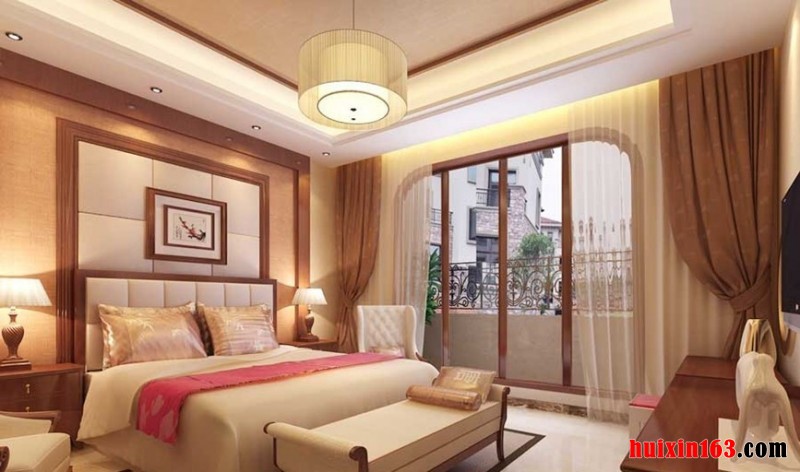 卧室的整个装饰着重点在实木装饰上,白色的石膏板吊顶装饰加深了空间的通透和延伸感,一个大型的古典吊灯的使用更是让空间的环境温馨和惬意,整体装修效果是非常的奢华和具有浓烈的古典气息的。此套设计整体色调尽显古香古色之基调,古典家装元素被运用到家装的方方面面,实木地板,连同电视背景墙都是跟地板一样的色调,尽显古朴典雅,墙纸的运用跟整个色调极其一致。