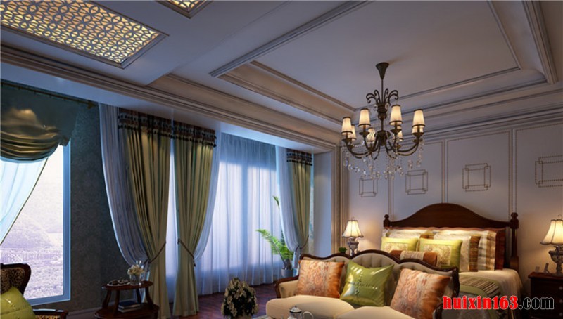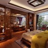 卧室的整个装饰着重点在实木装饰上,白色的石膏板吊顶装饰加深了空间的通透和延伸感,一个大型的古典吊灯的使用更是让空间的环境温馨和惬意,整体装修效果是非常的奢华和具有浓烈的古典气息的。此套设计整体色调尽显古香古色之基调,古典家装元素被运用到家装的方方面面,实木地板,连同电视背景墙都是跟地板一样的色调,尽显古朴典雅,墙纸的运用跟整个色调极其一致。
