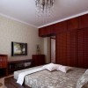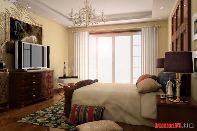 卧室的整个装饰着重点在实木装饰上,白色的石膏板吊顶装饰加深了空间的通透和延伸感,一个大型的古典吊灯的使用更是让空间的环境温馨和惬意,整体装修效果是非常的奢华和具有浓烈的古典气息的。此套设计整体色调尽显古香古色之基调,古典家装元素被运用到家装的方方面面,实木地板,连同电视背景墙都是跟地板一样的色调,尽显古朴典雅,墙纸的运用跟整个色调极其一致。