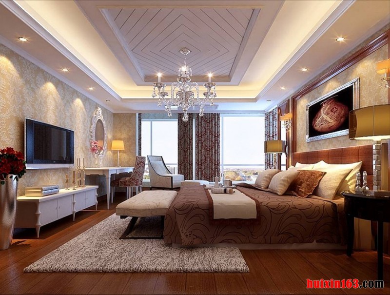 卧室的整体装饰简约舒适又明了,白色的石膏板吊顶装备搭配上造型奇特的大型水晶灯的使用瞬间提升了空间的开阔性和奢华感,实木的家具搭配给人的舒适感比较强烈,卧室的奢华大气带来更多的诠释。