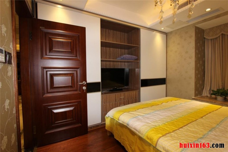 卧室的整体装饰简约舒适又明了,白色的石膏板吊顶装备搭配上造型奇特的大型水晶灯的使用瞬间提升了空间的开阔性和奢华感,实木的家具搭配给人的舒适感比较强烈,卧室的奢华大气带来更多的诠释。