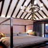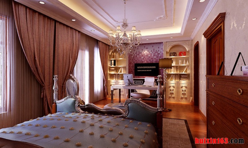 卧室的整体装饰简约舒适又明了,白色的石膏板吊顶装备搭配上造型奇特的大型水晶灯的使用瞬间提升了空间的开阔性和奢华感,实木的家具搭配给人的舒适感比较强烈,卧室的奢华大气带来更多的诠释。
