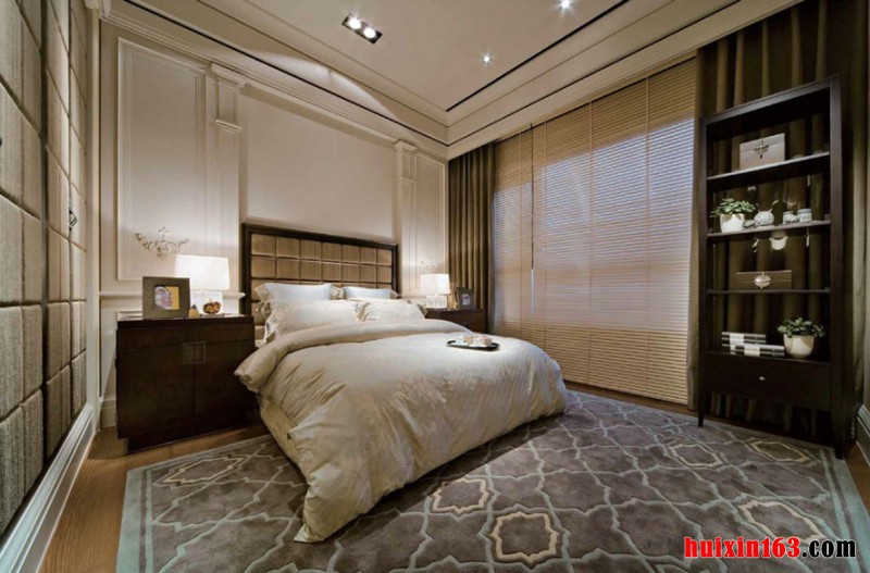 卧室的整个装饰新颖又大气,白色的石膏板吊顶装置搭配上实木的雕刻边框,加上古典的大型灯饰的使用更具有大气凛然的感觉,实木地板的使用提升了室内的舒适度还从一定的程度上加深了主人的生活品味。