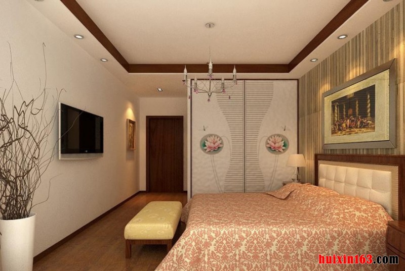 卧室的整个装饰新颖又大气,白色的石膏板吊顶装置搭配上实木的雕刻边框,加上古典的大型灯饰的使用更具有大气凛然的感觉,实木地板的使用提升了室内的舒适度还从一定的程度上加深了主人的生活品味。