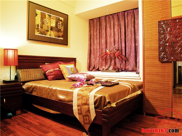 中式古典的装修除了要采用大量的实木建材以外,还必须通过色彩的搭配,才能完美的将古典的韵味演绎出来,在卧室的装饰当中,色彩的搭配比较稳重,个性的石膏板吊顶通过实木线条的装饰,在通过光线的营造,打造出一份复古的韵味,床墙面的背景墙后一幅壁画的悬挂,通过内容体现出业主是一个尊重历史以及喜爱历史的人。