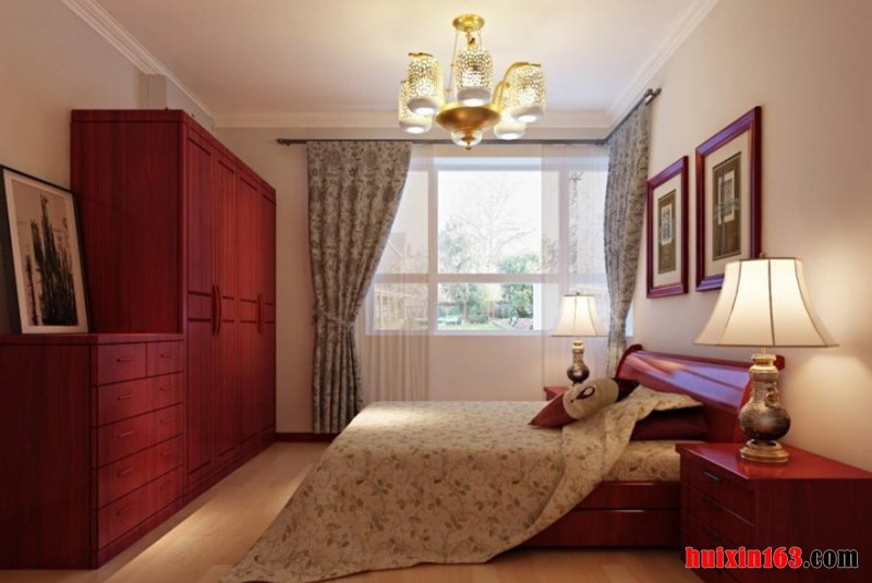 在卧室的地面上采用瓷砖进行铺设,墙面上采用白色的墙漆,体现出现代装饰的简约。在顶面上采用灯带加上造型奇特清新的吊灯营造出简约温馨明亮的居室环境。古典的家具让卧室的生活的味道更加的浓厚,深深的实木的色泽,厚重的设计风格,精巧的雕刻技术,让房间里面充满了视觉的盛宴。