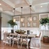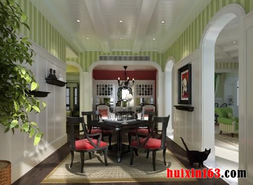 本套餐厅装饰中空间内的主色调是以淡淡的白色为主,整体可以带给人们一种大气感,石膏板吊顶的设计也很独特,凹槽的设计更是彰显了时尚感,中间一盏黑色铁艺吊灯,在四周白色灯带的照射下显得更加精致唯美,也为空间装饰增添了亮点。