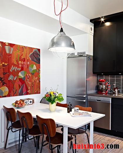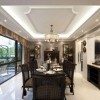 本套餐厅装饰中空间内的主色调是以淡淡的白色为主,整体可以带给人们一种大气感,石膏板吊顶的设计也很独特,凹槽的设计更是彰显了时尚感,中间一盏黑色铁艺吊灯,在四周白色灯带的照射下显得更加精致唯美,也为空间装饰增添了亮点。
