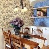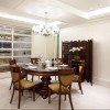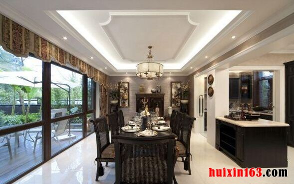 本套餐厅装饰中空间内的主色调是以淡淡的白色为主,整体可以带给人们一种大气感,石膏板吊顶的设计也很独特,凹槽的设计更是彰显了时尚感,中间一盏黑色铁艺吊灯,在四周白色灯带的照射下显得更加精致唯美,也为空间装饰增添了亮点。