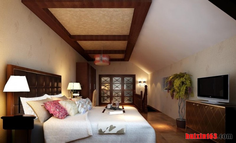 卧室的装饰当中,平顶式的石膏板吊顶,如果单纯的以纯白色为背景,未免显得比较单调,但是搭配上实木线条的装饰,就显得比较富有色彩感和设计感,而实木添置的家具以及亮丽的地砖混合使用,在视觉效果上迎面就能感受到古典的木质气息。