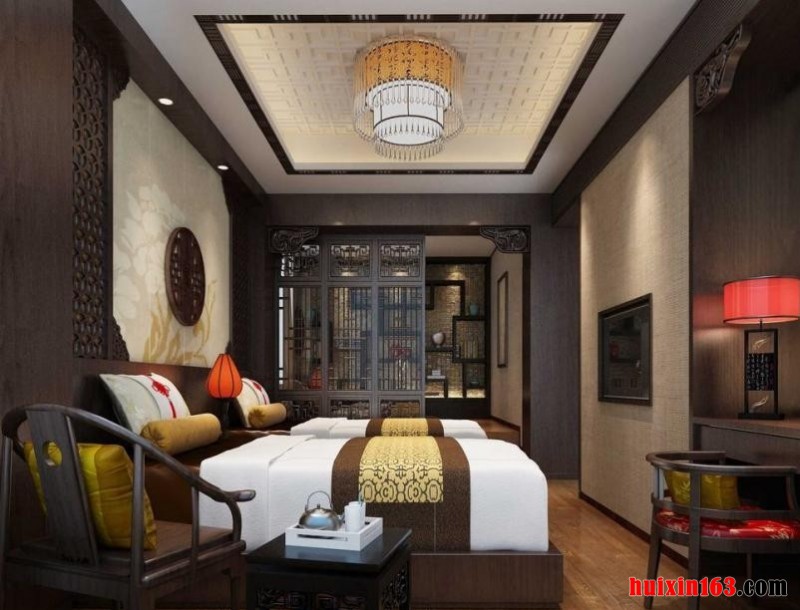 卧室的装饰当中,平顶式的石膏板吊顶,如果单纯的以纯白色为背景,未免显得比较单调,但是搭配上实木线条的装饰,就显得比较富有色彩感和设计感,而实木添置的家具以及亮丽的地砖混合使用,在视觉效果上迎面就能感受到古典的木质气息。