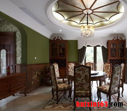 美式风格的餐厅装饰中整体的空间布局可以带给人你们一种舒适感,宽敞的空间内,色彩搭配也会以清新为主,偶尔的彩色点缀会使整个空间都显得十分惊艳,也会带给人们眼前一亮的感觉,从而人们可以从中感受到美式风格的特点。 本套餐厅装饰中石膏板吊顶的设计十分吸引人,石膏板中间镶嵌了以免带有格子图案的镜面装饰,搭配上水晶吊灯的照射,整个空间都会显得十分大气,同时也显得更加明亮,更加凸显了空间装饰的时尚感。 更多»推荐家装效果图