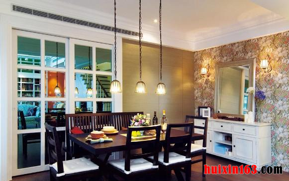 本套餐厅的整体装饰效果可以带给我们一种时尚感,空间内的墙壁上安装了一面镜面装饰,这样的设计搭配可以是整个空间都显得十分明亮,同时整个空间也因此而显得更加通透。