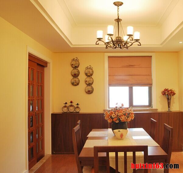 本套餐厅装饰中整体的装饰以及灯光色调搭配可以是整个空间显得十分具有古典气息,空间内的吊灯设计采用了装饰木条做造型,更加彰显了美式风格的装饰特点,同时也增添了空间装饰的设计感。
