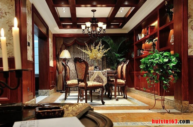 本套餐厅装饰中整体的装饰以及灯光色调搭配可以是整个空间显得十分具有古典气息,空间内的吊灯设计采用了装饰木条做造型,更加彰显了美式风格的装饰特点,同时也增添了空间装饰的设计感。
