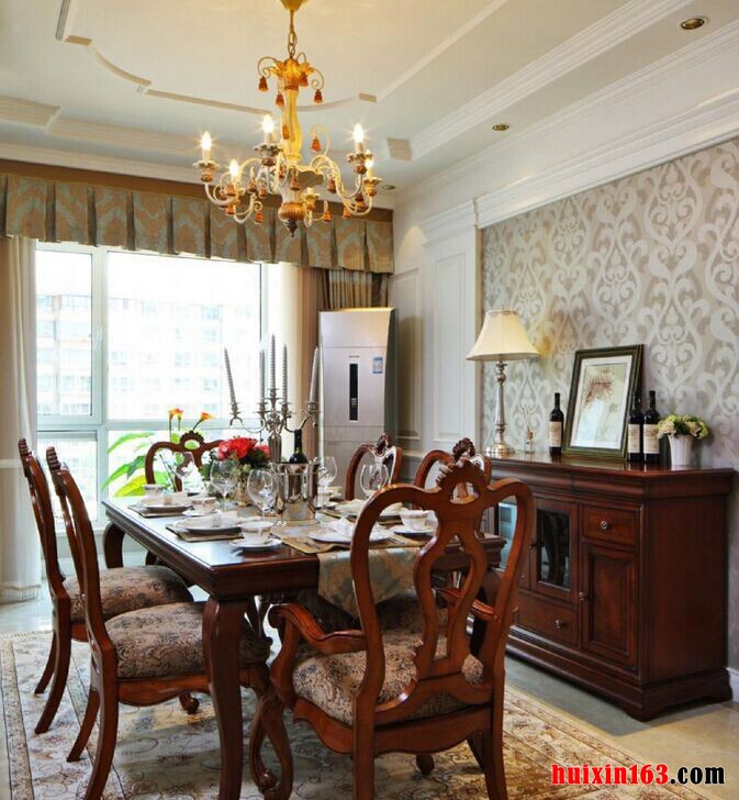 本套餐厅装饰中整体的装饰以及灯光色调搭配可以是整个空间显得十分具有古典气息,空间内的吊灯设计采用了装饰木条做造型,更加彰显了美式风格的装饰特点,同时也增添了空间装饰的设计感。