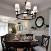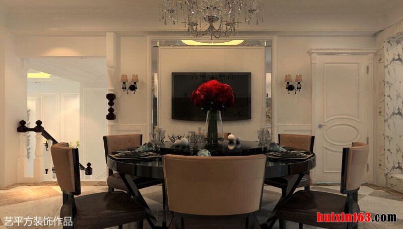 本套餐厅装饰中整体的装饰以及灯光色调搭配可以是整个空间显得十分具有古典气息,空间内的吊灯设计采用了装饰木条做造型,更加彰显了美式风格的装饰特点,同时也增添了空间装饰的设计感。