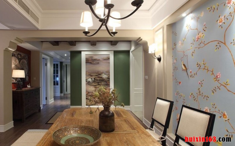 美式风格装饰的整体效果可以带给人们一种干净的舒适感,空间内的整体装饰色彩会比较淡雅,内部的装饰物品比较有讲究,可能是一幅抽象画也可能是以多新鲜花束,搭配在这样的空间内,都会带给人们一种新鲜感。 本套餐厅装饰中整体的装饰以及灯光色调搭配可以是整个空间显得十分具有古典气息,空间内的吊灯设计采用了装饰木条做造型,更加彰显了美式风格的装饰特点,同时也增添了空间装饰的设计感。 更多»推荐家装效果图