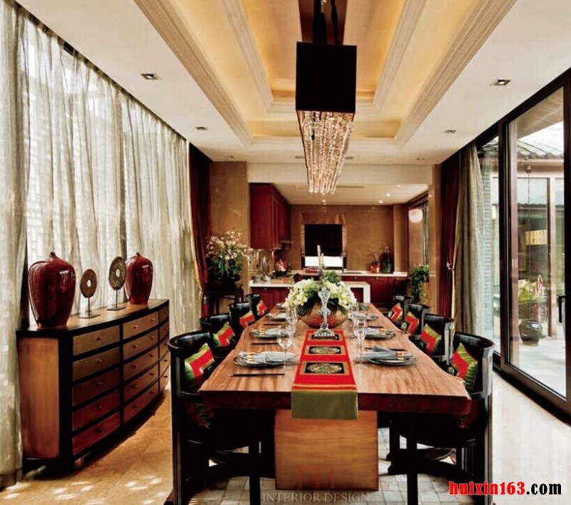 本套餐厅装饰中石膏板吊顶的设计采用了平顶式的设计,中间悬挂了一盏造型简单却又十分具有时尚气息的装饰吊灯,整体的装饰搭配是下方的实木餐桌显得更加典雅。同时也彰显了装饰的个性。