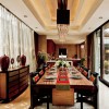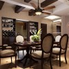 本套餐厅装饰中石膏板吊顶的设计采用了平顶式的设计,中间悬挂了一盏造型简单却又十分具有时尚气息的装饰吊灯,整体的装饰搭配是下方的实木餐桌显得更加典雅。同时也彰显了装饰的个性。