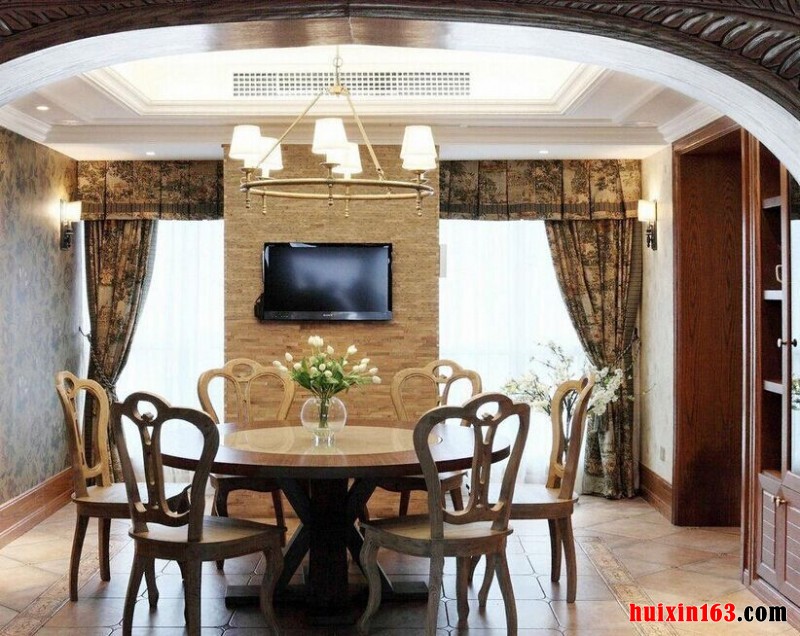 美式风格的餐厅装饰中往往都会用花束来点缀空间,娇嫩的花朵摆放在餐桌中间可以活跃空间气氛并且可以使整个空间都充满清新的气息,在搭配上灯光以及墙壁色彩的衬托,更是可以将设计感彰显的淋漓尽致。