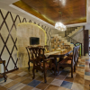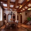 本套餐厅装饰中石膏板吊顶的设计采用了平顶式的设计,中间悬挂了一盏造型简单却又十分具有时尚气息的装饰吊灯,整体的装饰搭配是下方的实木餐桌显得更加典雅。同时也彰显了装饰的个性。