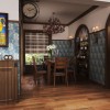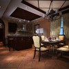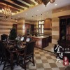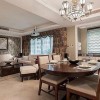 在本套餐厅装饰中空间的整体装饰效果可以带给人们一种大气感,石膏板吊顶的设计中又可以显露出一丝精致的设计感,吊顶中间圆形的镂空设计可以将中间的铁艺吊灯衬托的十分别致,同时也将美式风格彰显的更加淋漓尽致。