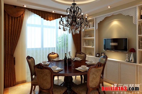 在本套餐厅装饰中空间的整体装饰效果可以带给人们一种大气感,石膏板吊顶的设计中又可以显露出一丝精致的设计感,吊顶中间圆形的镂空设计可以将中间的铁艺吊灯衬托的十分别致,同时也将美式风格彰显的更加淋漓尽致。