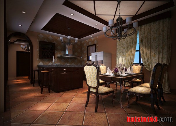 在本套餐厅装饰中空间的整体装饰效果可以带给人们一种大气感,石膏板吊顶的设计中又可以显露出一丝精致的设计感,吊顶中间圆形的镂空设计可以将中间的铁艺吊灯衬托的十分别致,同时也将美式风格彰显的更加淋漓尽致。