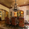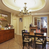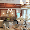 在本套餐厅装饰中空间的整体装饰效果可以带给人们一种大气感,石膏板吊顶的设计中又可以显露出一丝精致的设计感,吊顶中间圆形的镂空设计可以将中间的铁艺吊灯衬托的十分别致,同时也将美式风格彰显的更加淋漓尽致。