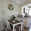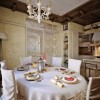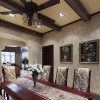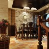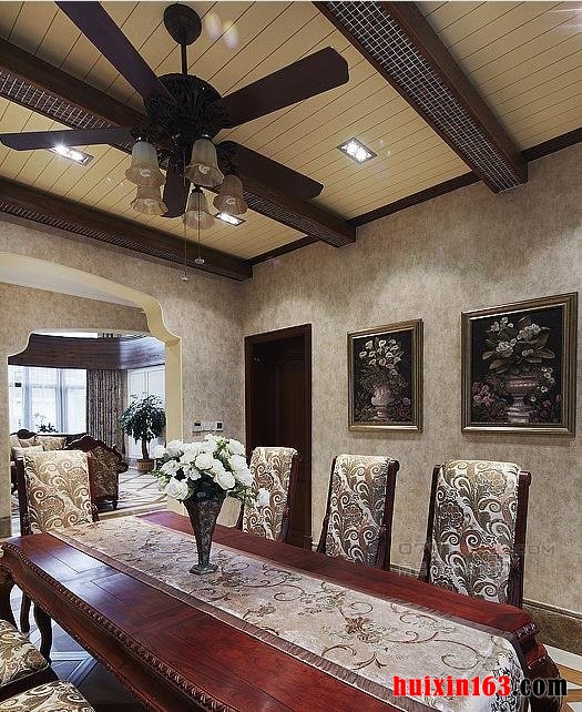 本套餐厅装饰中石膏板吊顶的设计比较独特,中间悬挂了一盏造型别致却带有一丝古典气息的装饰吊灯,将下放的红色餐桌也衬托的更加具有古典气息,一款素雅的桌旗横铺在餐桌上方,更加彰显了装饰的大气。