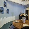 本套餐厅装饰中石膏板吊顶的设计比较独特,中间悬挂了一盏造型别致却带有一丝古典气息的装饰吊灯,将下放的红色餐桌也衬托的更加具有古典气息,一款素雅的桌旗横铺在餐桌上方,更加彰显了装饰的大气。