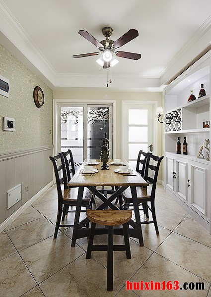 美式风格的家具会在精致中呈现出一丝休闲的气息感,家具的材质以及款式设计都黑别致,优越的质感搭配上精美的款式,可以使其显得十分唯美,同时也可以呈现出美式风格的经典涵韵。 本套餐厅装饰中空间内的色彩搭配主要是以白色为主,整体的装饰可以带给人们一种大气感,同时也可以通过细节的处理彰显出一丝精致与唯美,餐厅内的石膏板吊顶采用了凹槽设计可以更将灯饰的设计衬托出来。 更多»推荐家装效果图