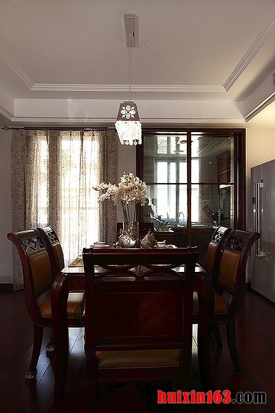 本套餐厅装饰中空间内的色彩搭配主要是以白色为主,整体的装饰可以带给人们一种大气感,同时也可以通过细节的处理彰显出一丝精致与唯美,餐厅内的石膏板吊顶采用了凹槽设计可以更将灯饰的设计衬托出来。