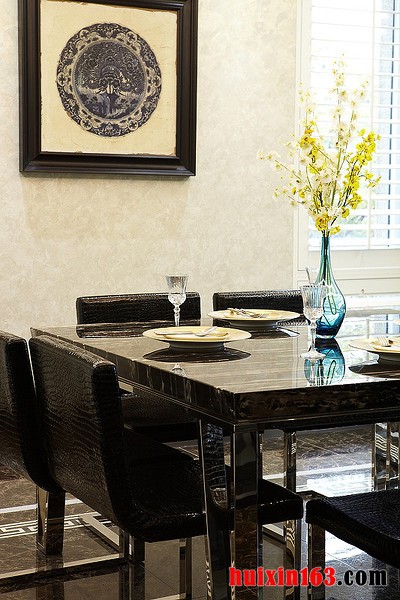 本套餐厅装饰中空间内的色彩搭配比较素雅,石膏板吊顶采用了平顶式的设计,可以将中间的水晶吊灯衬托的更加精致,灰色的水晶吊坠搭配上黑色的铁艺吊杆,更是可以将灯饰的华美彰显的淋漓尽致。