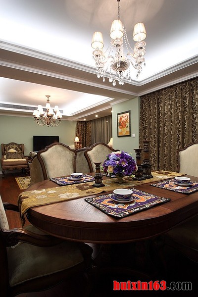美式风格的家具往往都会拥有精美的轮廓,优秀的质地,从而可以使整个空间都显得十分具有自然气息,美式风格的居室装修也会比较注重细节的处理,可以从细小的处理中彰显出一种美式风格的涵韵。 本套餐厅装饰中空间内的色彩搭配比较素雅,石膏板吊顶采用了平顶式的设计,可以将中间的水晶吊灯衬托的更加精致,灰色的水晶吊坠搭配上黑色的铁艺吊杆,更是可以将灯饰的华美彰显的淋漓尽致。 更多»推荐家装效果图