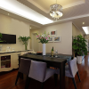 本套餐厅装饰中空间内的色彩搭配比较素雅,石膏板吊顶采用了平顶式的设计,可以将中间的水晶吊灯衬托的更加精致,灰色的水晶吊坠搭配上黑色的铁艺吊杆,更是可以将灯饰的华美彰显的淋漓尽致。