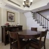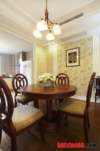 美式风格的家具往往都会拥有精美的轮廓,优秀的质地,从而可以使整个空间都显得十分具有自然气息,美式风格的居室装修也会比较注重细节的处理,可以从细小的处理中彰显出一种美式风格的涵韵。 本套餐厅装饰中空间内的色彩搭配比较素雅,石膏板吊顶采用了平顶式的设计,可以将中间的水晶吊灯衬托的更加精致,灰色的水晶吊坠搭配上黑色的铁艺吊杆,更是可以将灯饰的华美彰显的淋漓尽致。 更多»推荐家装效果图